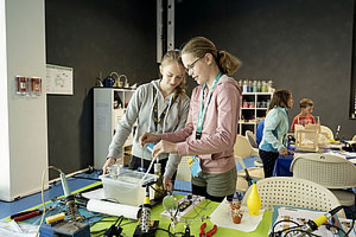 Ein weiteres bewährtes Angebot: die Ideenwerkstadt. Das ist ein Netzwerk, bestehend aus 20 beteiligten Einrichtungen mit ihren jeweiligem Werkstattangeboten. Hier können die Besucher unter naturwissenschaftlich oder technisch orientierten Angeboten wählen, was sie interessiert, ausprobieren, spielerisch lernen und handfeste Ergebnisse mitnehmen.